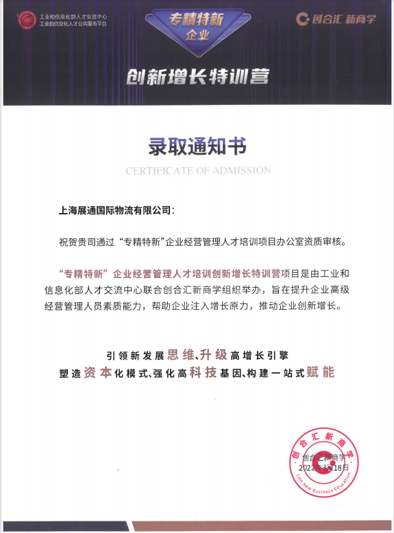 本次专精特新训练营从7月23日持续至9月17日,旨在通过提升企业家自主创新能力,支持企业家争做创新发展的探索者、组织者、引领者而为’专精特新’企业赋能。上海展通国际物流有限公司作为特训营成员之一,由公司副总经理代表公司管理层亲自出席并全程参与了本次训练营计划。在现场不仅认真聆听了专家老师们对企业“专精特新”发展之路的深度剖析,还积极与众企业家分享企业一路走来的心路历程。尽管在过去十多年里展通一直秉承着创新精神,通过数字透明供应链的解决方案为在华跨国企业解决零备件管理的难题,但展通也清楚地认识到“专精特新”中小企业的发展不可能一蹴而就,体系化的建设要稳扎稳打,重视数量,更要重视质量。相信通过这次近距离的学习和交流,上海展通将获得更多活力和信心,为客户持续高效提供智慧供应链服务的创新能力。展通也定将在上海市数字化转型浪潮中,担负起自己的社会责任,为行业企业蓬勃的发展贡献自己的力量。
